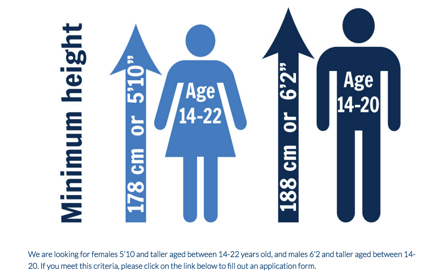 We measure height, weight, and C2 scores in the main. For The Start Programmethe height minimum from age 14 to 22 is 178cm for women and 188 for men. To see the data they collect on applicants, fill out the Application Form