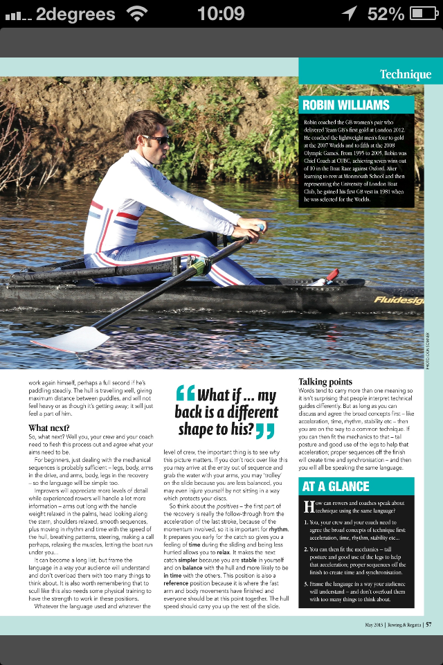 I think coaches should understand the physics of rowing, after all it explains how the boat and athlete move in relation to each other. Drew Ginnm who knows a thing or two about rowing, has done a piece on YouTube about how quickly you should move up the slide. I seem to remember he spoke about pulling yourself up the slide, but he also went on to talk about what speed you should arrive at front stops. Its connected to this subject and I seem to remember he held a slightly different view to some of his coaches!